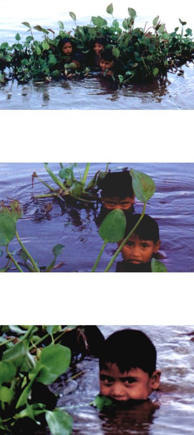 To my surprise, as I aimed my camera, it was not the head of a snake that came out, but two, three, four heads were peeking out from the water lilies. Imitating the behavior of the anaconda, four children were hiding in the bora to get a chance to have a better look at something very weird in that area of the jungle: me - I was their story to tell.